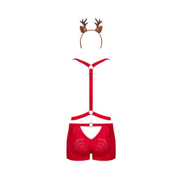 ¡El juguetón Sr. Reno está de humor para divertirse! El arnés rojo picante y los tentadores calzoncillos son un par muy sexy y sensual, listo para hacer travesuras en el dormitorio. La diadema con orejas de reno es un elemento sumamente encantador que complementa a la perfección el conjunto.